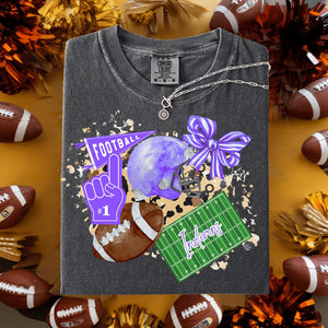 Show your team spirit with this playful football collage tee! Customize your shirt by choosing your favorite mascotβlike a fierce leopardβand pick your own colors and town to make it truly yours. Perfect for game days or casual wear, this graphic tee lets you celebrate your team pride in style and comfort.
