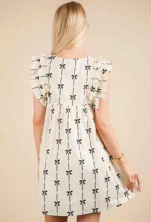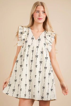 Cream Bow Print Babydoll Mini Dress