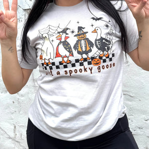 "Get in the Halloween spirit with our Just A Spooky Goose Soft Graphic Tee. Made from soft, comfortable material, it's perfect for all your spooky adventures. Plus, the cute graphic adds a fun touch to any outfit. (Goosebumps included!)"