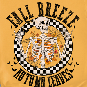 Embrace the spooky season with a playful twist in our Fall Breeze Skeleton Graphic Tee. Featuring a charming skeleton design perfect for crisp autumn days, this tee adds fun and flair to your seasonal wardrobe. Soft, comfortable, and ready for pumpkin patch adventures or cozy bonfires, itβs your go-to for festive fall vibes.